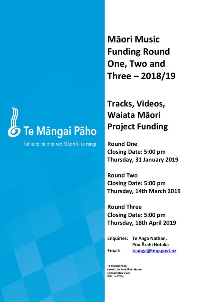Māori Music Funding Round One, Two and Three – 2018/19 Posted on December 18, 2018 by radiongatiporou_myu6aq Posted in Latest News Applications for funding are now live and the link can be found at: https://www.tmp.govt.nz/our-funding Share this:FacebookTwitterPrintLike this:Like Loading...